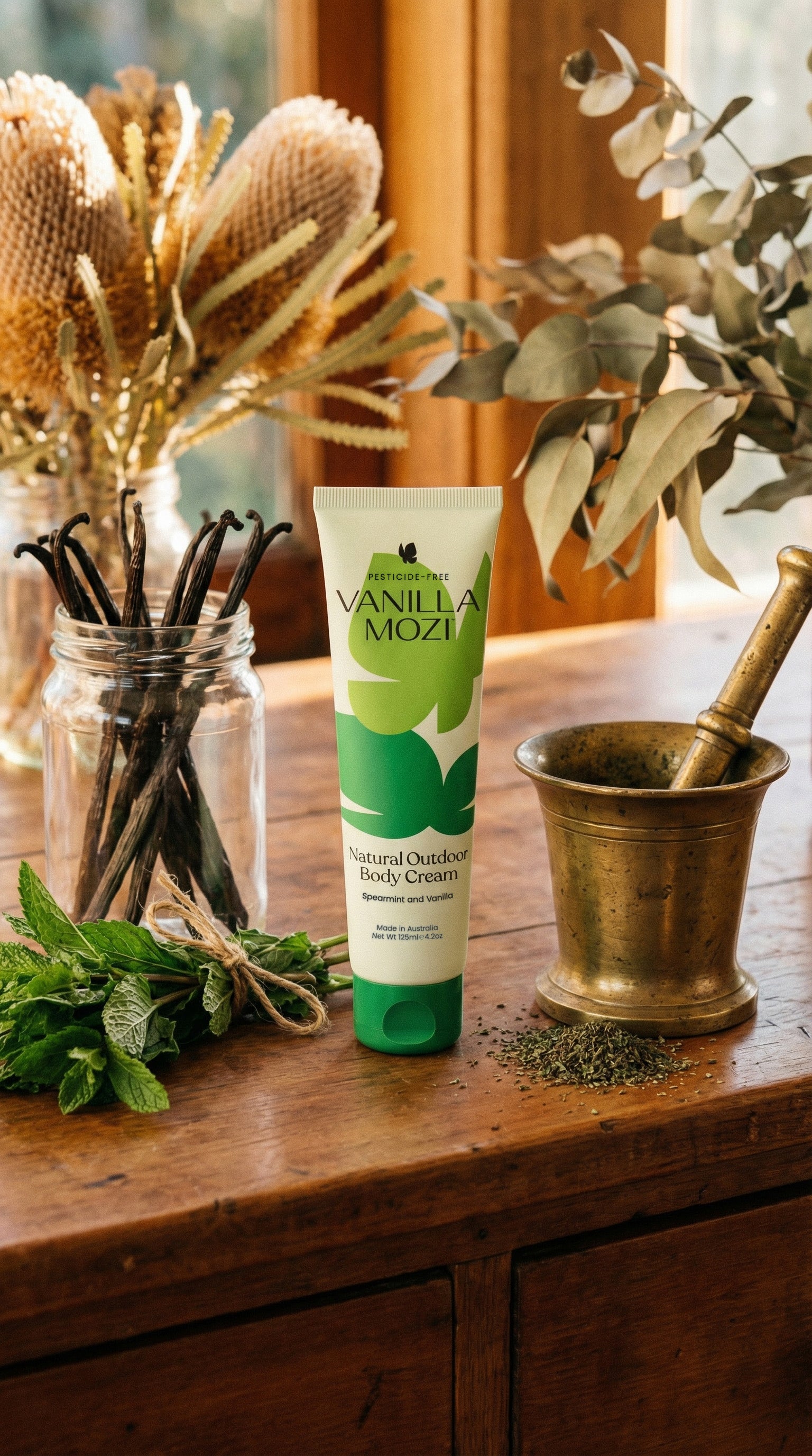 The Vanilla Mozi Proprietary Blend — a fusion of pure vanilla and spearmint essential oils — formulated by founder Lea-Anne Crawford in exactly the right concentration and combination to activate the biomimicry effect. This is not a fragrance added for appeal. The sweet vanilla and fresh spearmint you can smell is the science working — interacting with the carboxylic acids in human sweat at a molecular level, neutralising the human scent signature that attracts nature's uninvited guests, and creating a botanical veil around your skin.